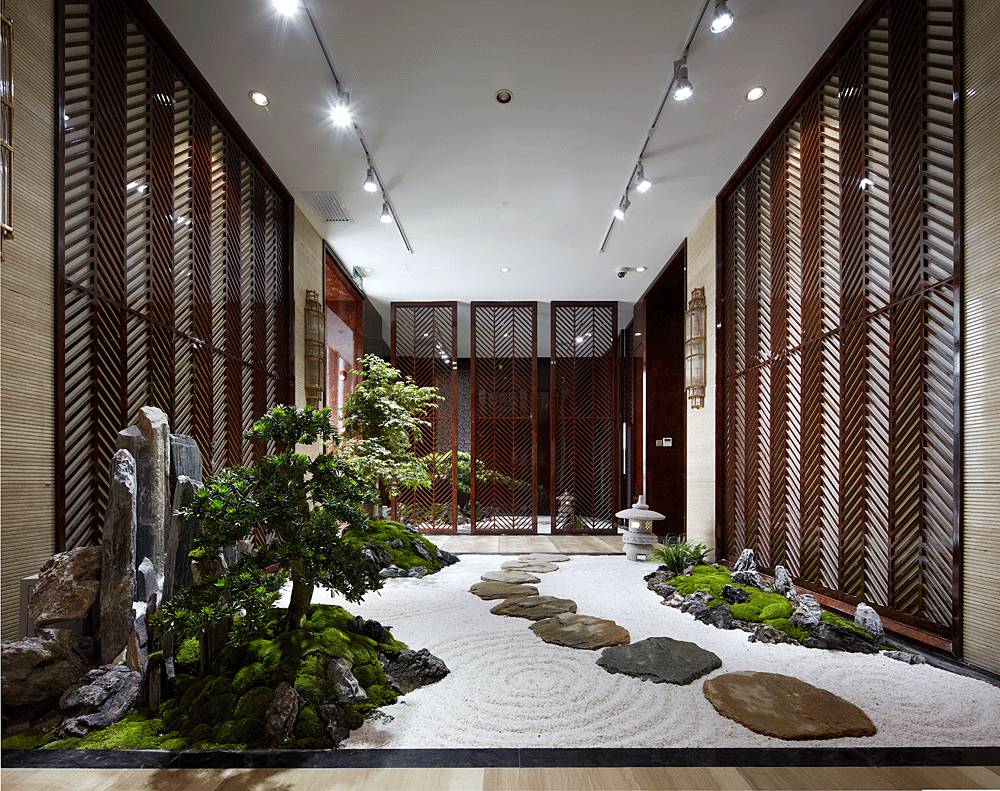 值得一提的是,走廊干景步道的景觀軟裝,一個(gè)集觀賞、生態(tài)、自然于一體的設(shè)計(jì)。小巧石籠、粒徑不等的灘石,旱濕均可培植的苔草地被,有機(jī)地組合在一起傳遞古樸自然的審美趣味,讓營銷中心的意境之美濃郁幾分。