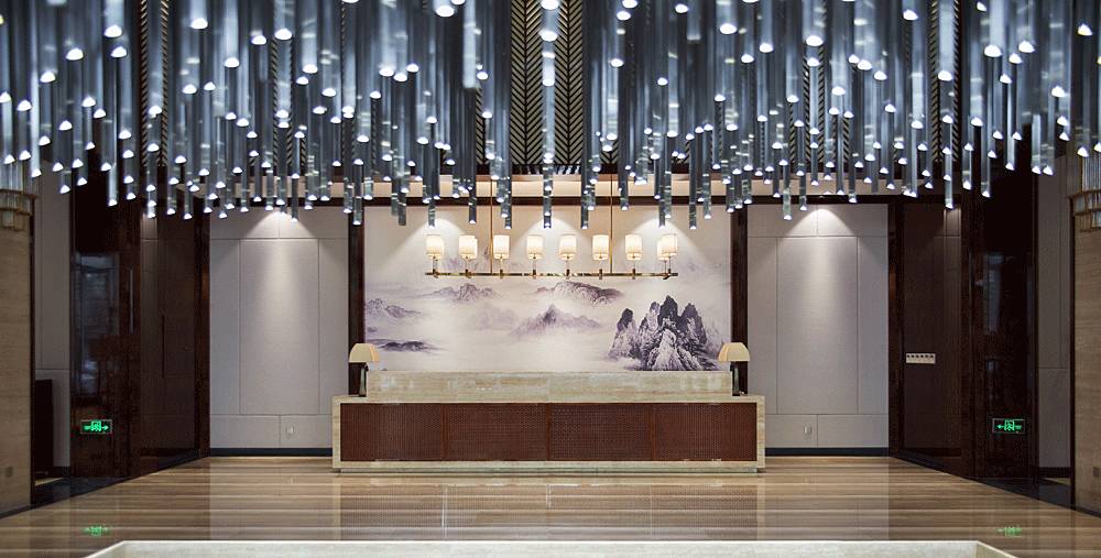 進(jìn)入大堂中心,便被一個(gè)奪人眼目的裝置藝術(shù)吸引,數(shù)百根不銹鋼條垂吊而下,宛如瀑布“飛流直下三千尺,疑是銀河落九天”,成為整個(gè)空間的視覺焦點(diǎn),啟動(dòng)后,水珠從不銹鋼滴落到地景的水中,呈現(xiàn)出“大珠小珠落玉盤”的動(dòng)感。