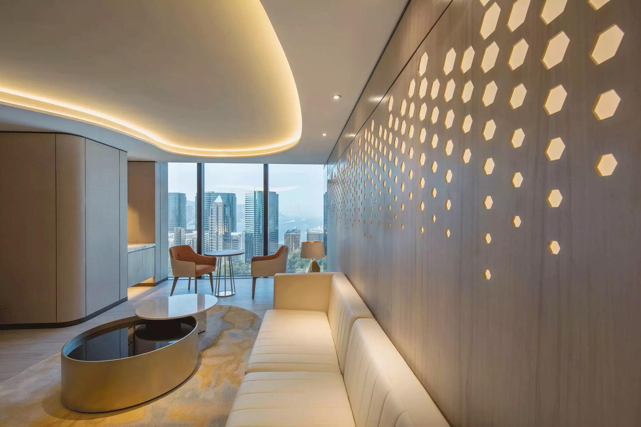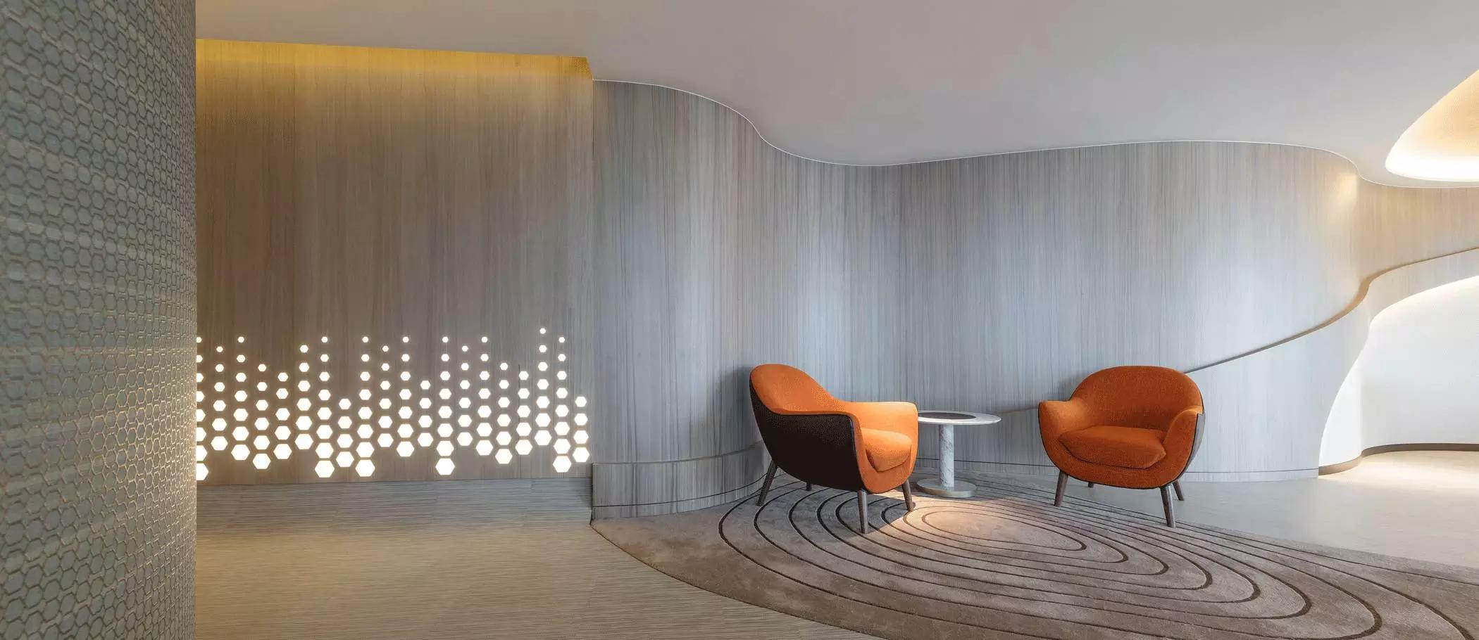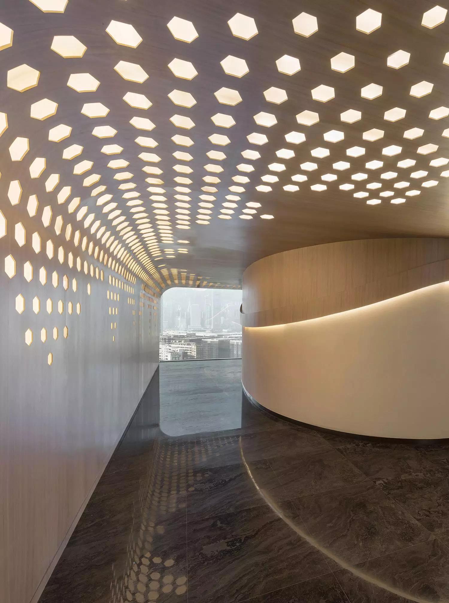 蜂窩形狀滲進(jìn)天花至墻身的燈箱以及屏風(fēng),體現(xiàn)出大自然的親和力讓人心沈靜,宛若森林小徑,葉縫間穿過而灑落的陽光,體現(xiàn)日本韻文中的「Komorebi」靜謐而悠閑涵蘊希望。