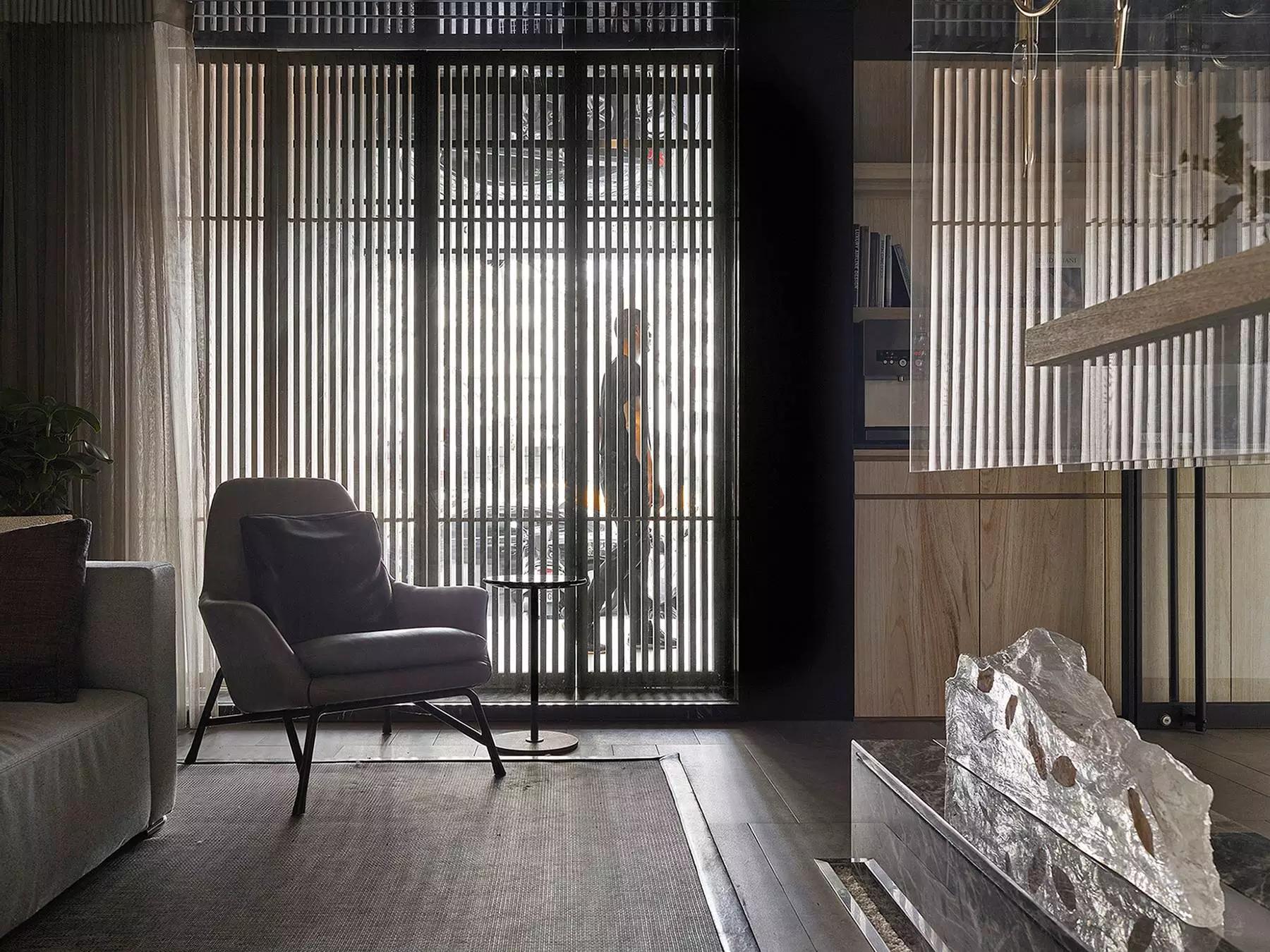 將玄關(guān)刻意退縮于室內(nèi)、入口大門轉(zhuǎn)向,而產(chǎn)生一進(jìn)一景之空間體驗(yàn)層次,寬闊的騎樓面積與門口的虛空間,未踏入空間卻已感受沈穩(wěn)安定。