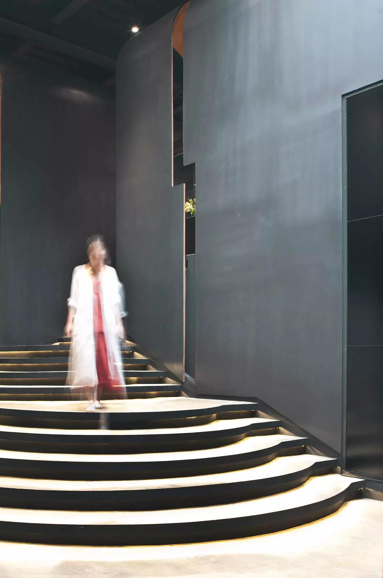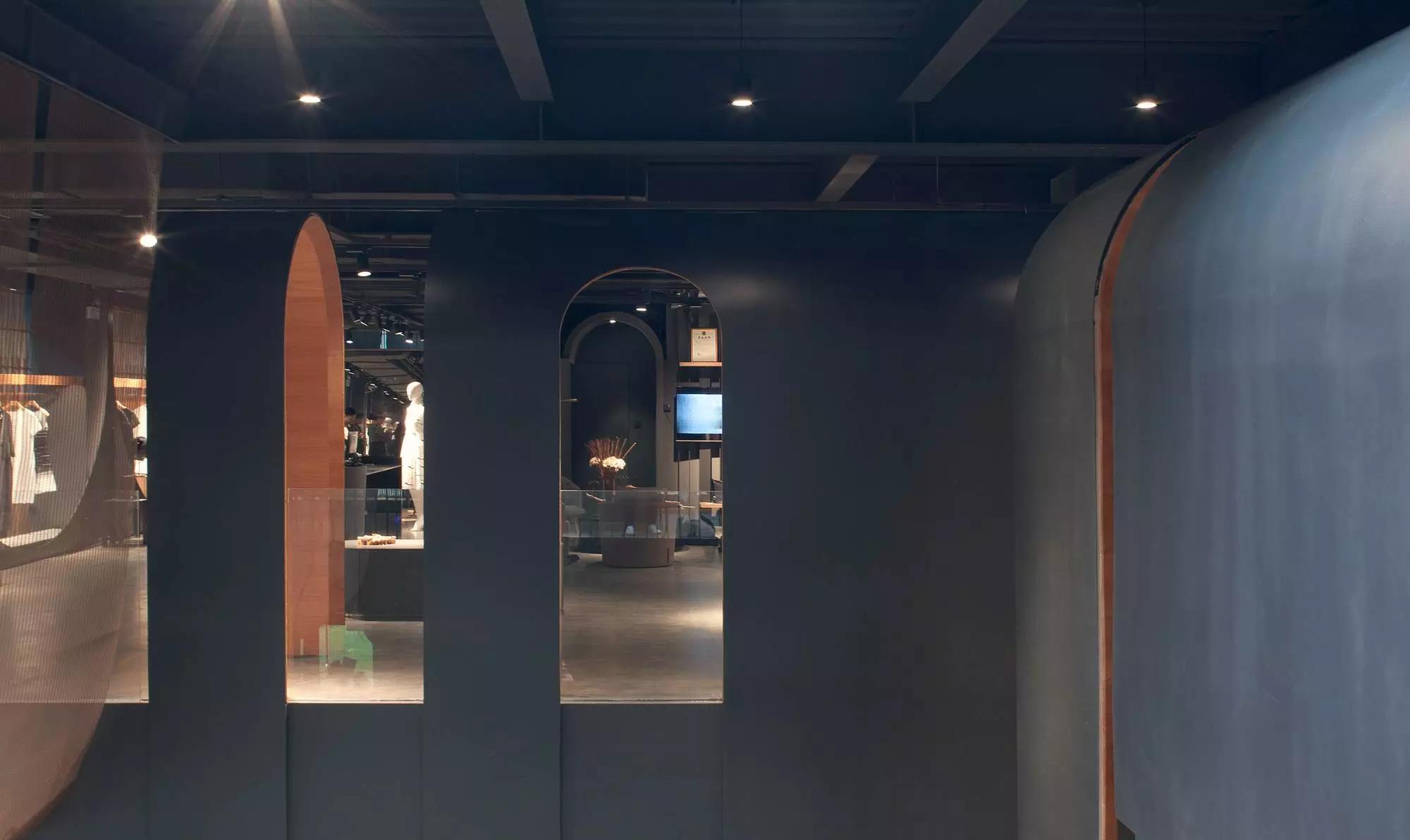 內(nèi)部空間希望呈現(xiàn)一種原始野性的魅力,采用鋼制的表皮帶來一種現(xiàn)實(shí)感。這種“直白”式的架構(gòu)材料,空間所形成的直接性與樸素性,加上大尺度的鋼板落地產(chǎn)生的力量感或輕盈感,使整個(gè)空間與原有場(chǎng)地建筑取得一種時(shí)間與空間的接續(xù)關(guān)系。利用“拱”多變的空間特性,產(chǎn)生不同的空間,打破了均質(zhì)的體驗(yàn)。這是一個(gè)回憶的過程,再一次將建筑的體量與空間對(duì)話,越是簡(jiǎn)單的形體邏輯,越能給人帶來深刻的印象,弧拱曲線柔和,呈現(xiàn)不同角度的美感?;」暗倪B續(xù)曲線把空間構(gòu)造成圍合區(qū)域,在這樣的方式下,內(nèi)部和外部保持著空間的連續(xù)性,這個(gè)理念使空間不拘泥于常規(guī),探索傳統(tǒng)類型空間的新秩序,"拱"在傳統(tǒng)建筑中扮演重要角色,并且在漫長(zhǎng)的歷史中不斷豐富。我們?cè)噲D轉(zhuǎn)化傳統(tǒng)"拱",讓"拱"在均質(zhì)呆板的現(xiàn)代空間上制造新的突破,獲得自然能量并把它轉(zhuǎn)化為空間秩序。濃烈的空間美感,顯示該品牌的重要意義?;」巴臻g一、二層相連,創(chuàng)建出有趣的空間狀態(tài),吸引顧客的好奇心。